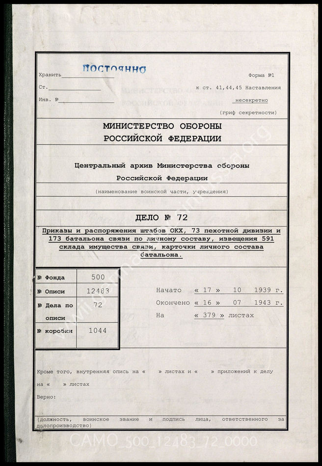 Top Фонд 500 Опись 12483 - Батальоны Дело 72. Документы отдела кадров 173-го батальона связи 73-й пехотн...